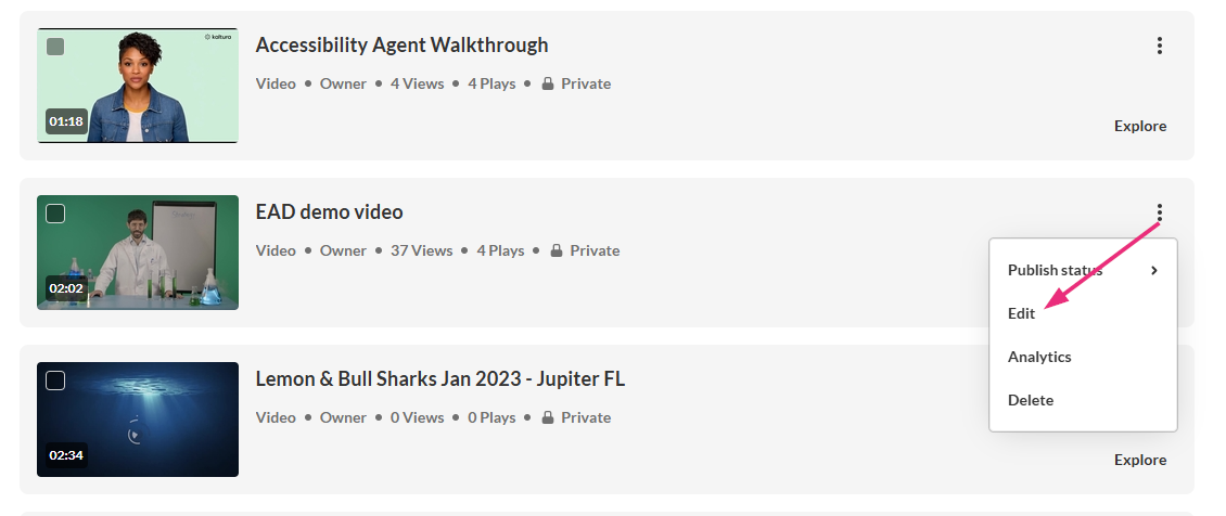 - Locate the desired media and click the three dots at the far right and select Edit.