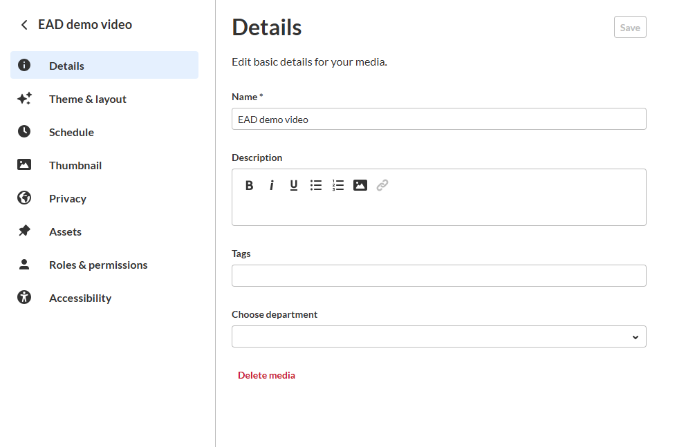 The edit media page opens on the Details tab by default, with a left-hand navigation.