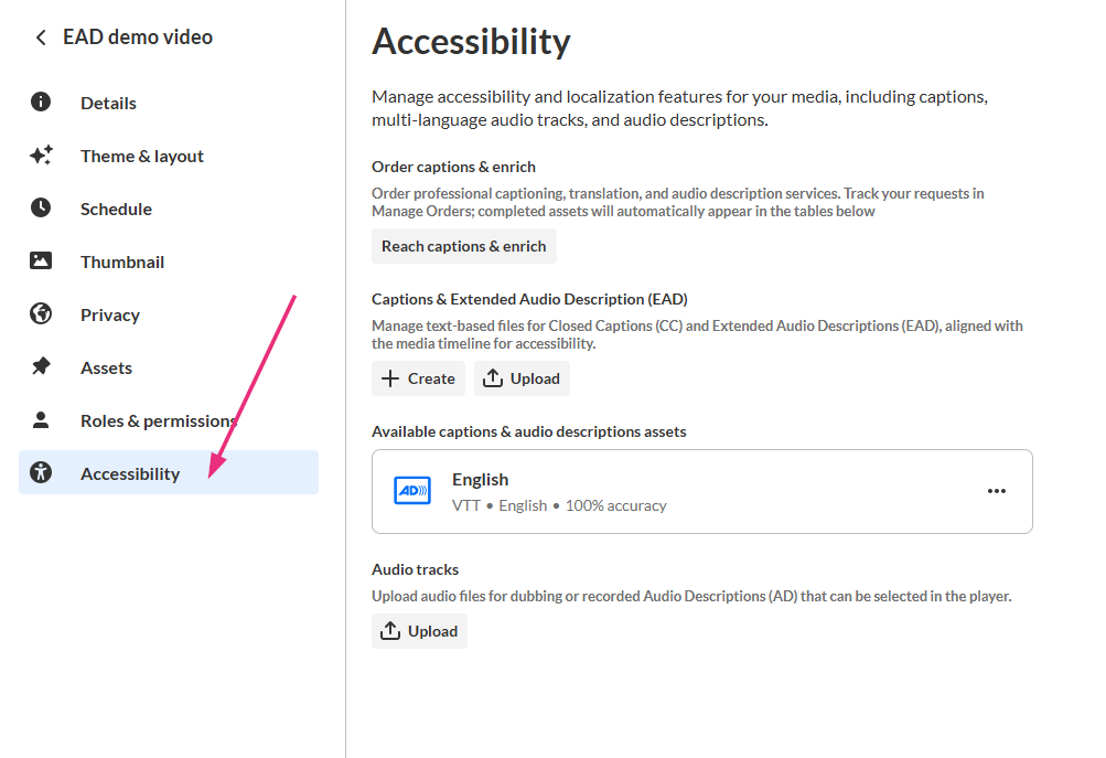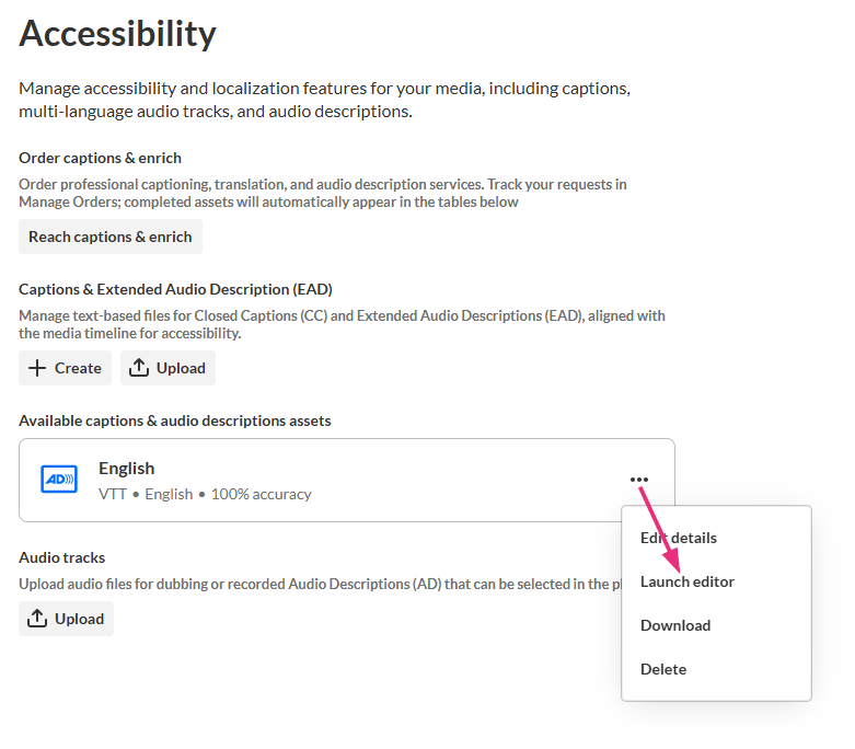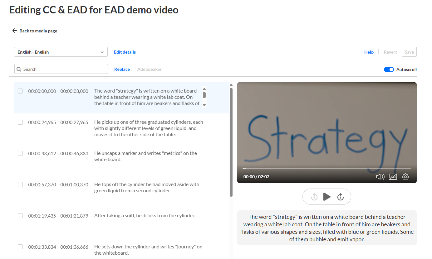EAD files are uploaded in VTT format and use the same editing interface as captions. Editing an EAD file doesn’t change its type or playback behavior.