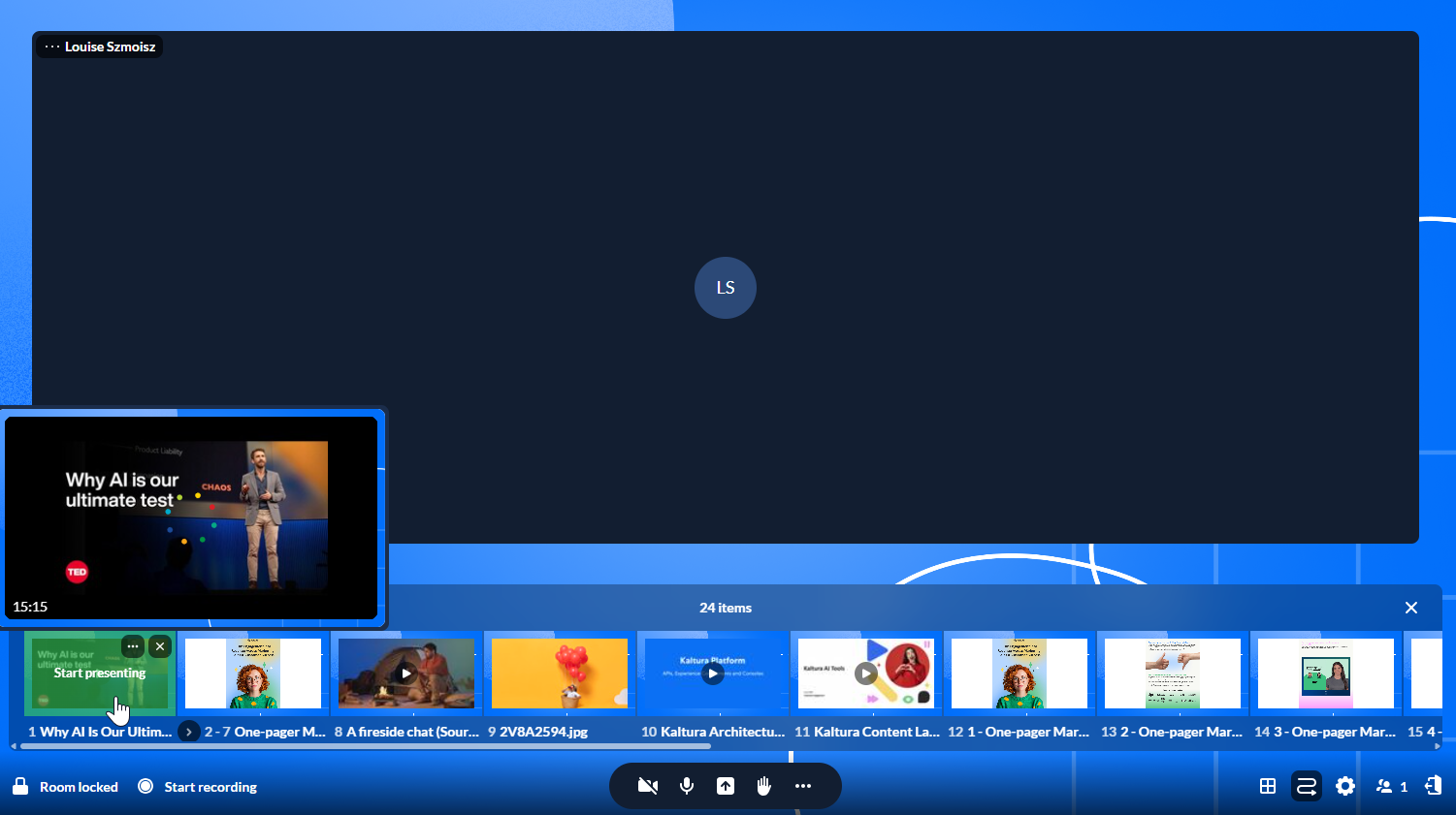 Moderators can use the storyboard in a Kaltura Room to manage and present media during a session. Media added to the storyboard can be presented, previewed, reordered, or removed at any time, making it easy to control the flow of content.