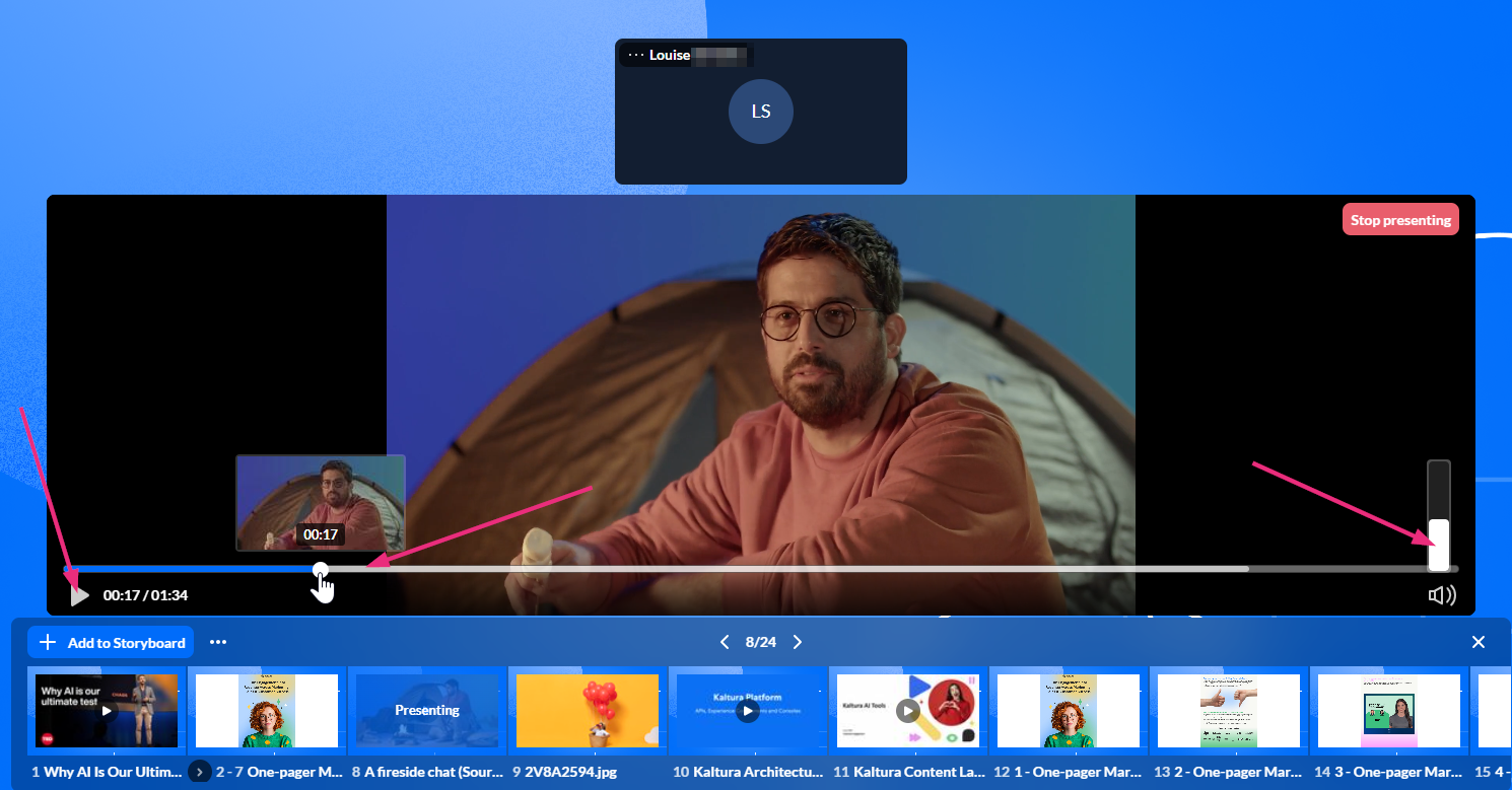 Participants do not see the storyboard. They only see the content presented on stage, without player controls such as the progress bar or volume.