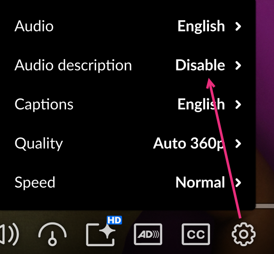 When a video includes a standard audio description track, it’s automatically available in the player.