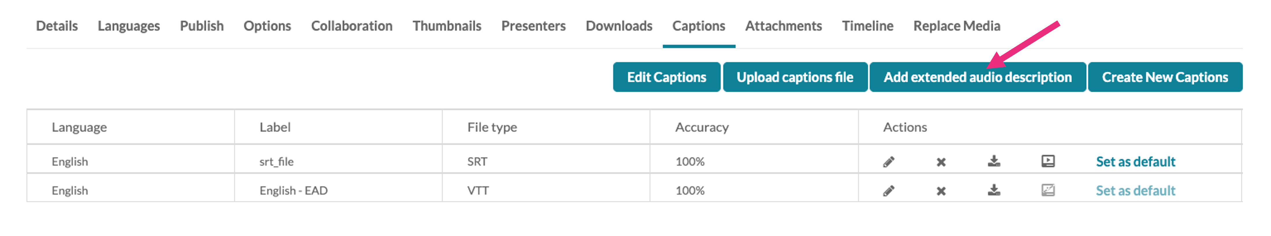 - EAD files are uploaded in VTT format and managed from the Captions tab on the edit media page using the 'Add extended audio description' button. Once uploaded, the Kaltura player converts the time-coded scene description text into a spoken narration, improving accessibility for viewers with visual impairments.