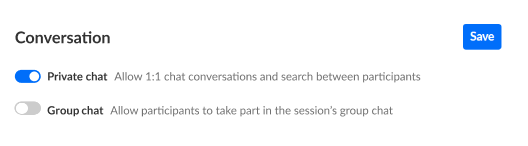 - Choose to enable or disable conversations for your webinar by sliding the button next to the specific conversation type to the left (to disable) or to the right (to enable).