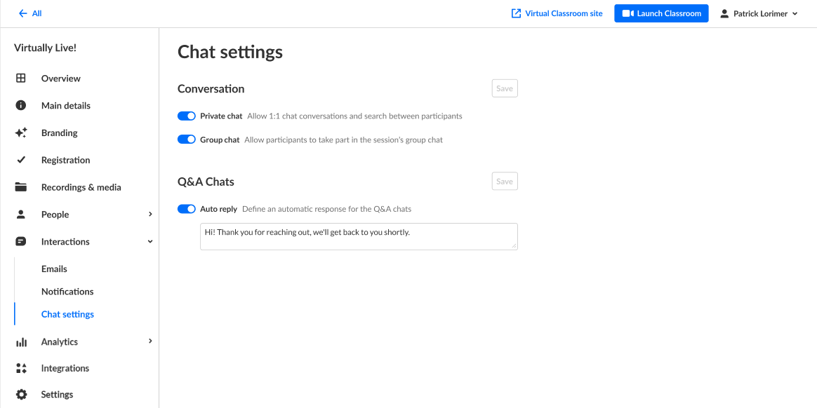 The Chat Settings page allows you to enable and disable conversations for your virtual classroom and define an automatic response for Q&A chats.