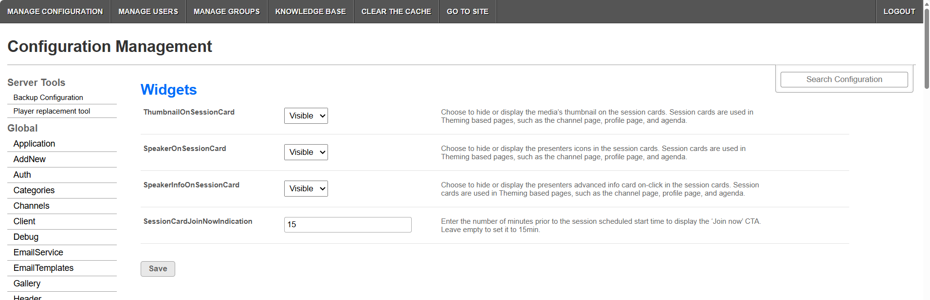 - Go to your Configuration Management console and click the Widgets module. You can also navigate directly using a link: https://{your_video portal_URL}/admin/config/tab/widgets.